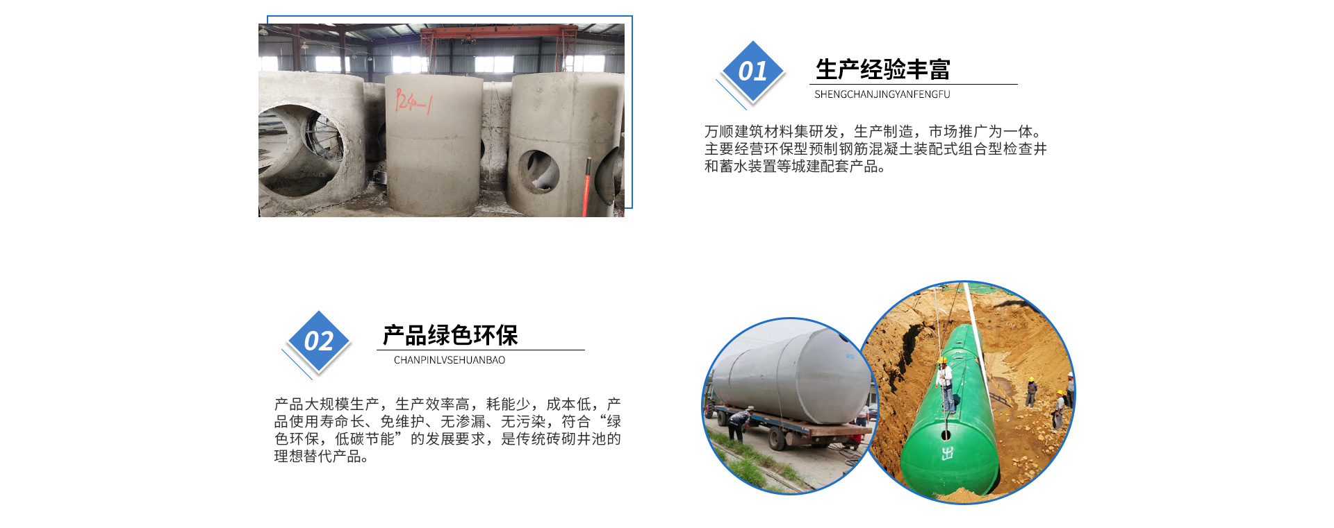黃山市萬順建筑科技有限公司是集研發(fā),生產(chǎn)制造,市場推廣為一體的綜合性企業(yè)。公司主要經(jīng)營環(huán)保型預(yù)制鋼筋混凝土裝配式組合型檢查井和蓄水裝置等城建配套產(chǎn)品。產(chǎn)品生產(chǎn)過程采用獨(dú)特的生產(chǎn)工藝,機(jī)械化流水作業(yè)。產(chǎn)品大規(guī)模生產(chǎn),生產(chǎn)效率高,耗能少,成本低,產(chǎn)品使用壽命長、免維護(hù)、無滲漏、無污染,符合“綠色環(huán)保,低碳節(jié)能”的發(fā)展要求,是傳統(tǒng)磚砌井池的理想替代產(chǎn)品。